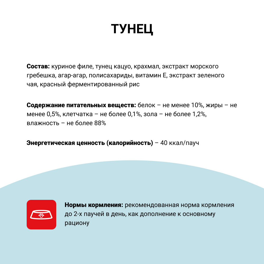 | Состав | куриное филе, кацуобуси, крахмал, экстракт морского гребешка, агар-агар, полисахариды, витамин Е, экстракт зеленого чая, красный ферментированный рис |