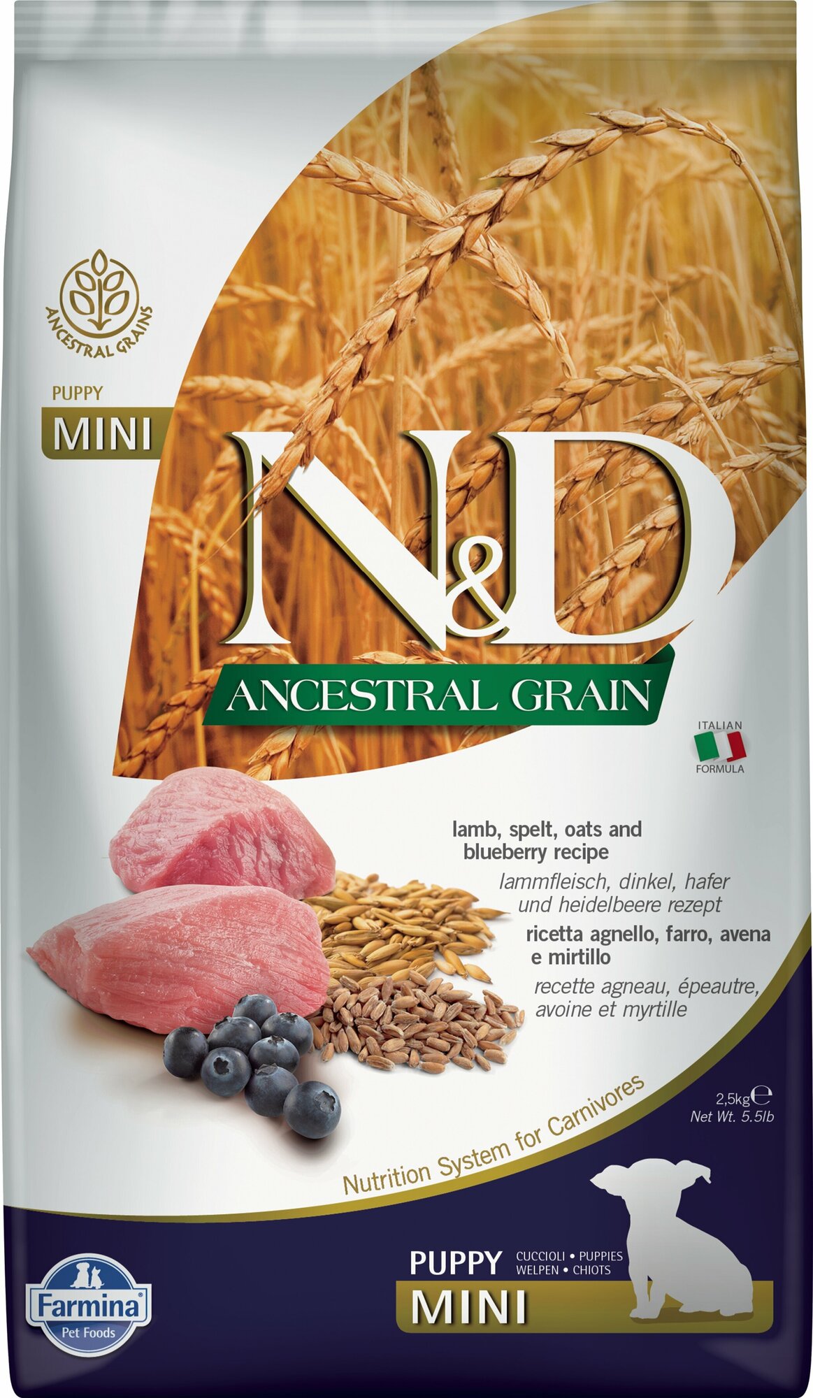 Сухой корм Farmina N&D Ancestral Grain Lamb & Blueberry Puppy Mini, низкозерновой, для щенков маленьких пород, ягненок и черника, 2,5 кг