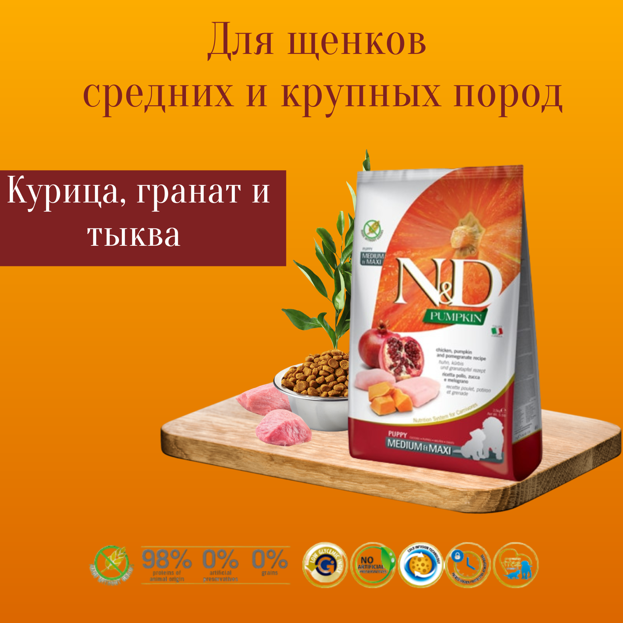 Farmina N&D Pumpkin Dog Chicken & Pomegranate Puppy Medium & Maxi сухой беззерновой корм для щенков средних и крупных пород с курицей, гранатом и тыквой - 2,5 кг
