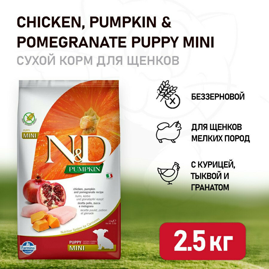 Сухой корм Farmina N&D Pumpkin Chicken & Pomegranate Puppy Mini, для щенков маленьких пород, беззерновой, курица, гранат, тыква, 2,5 кг