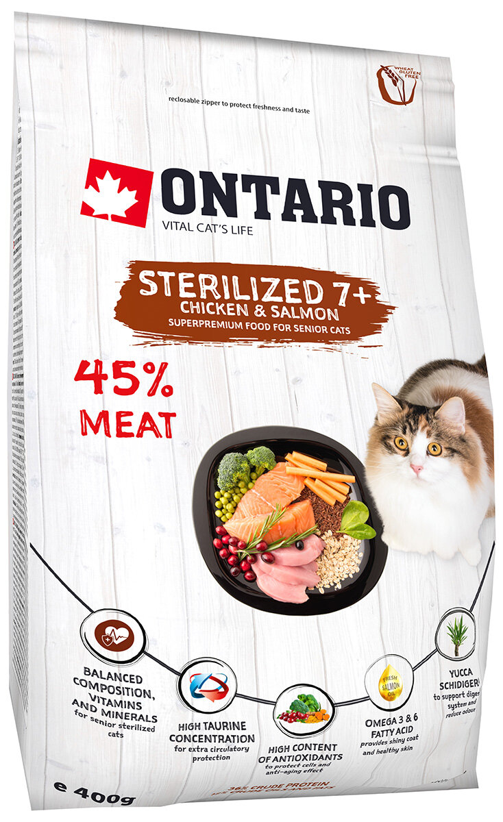 ONTARIO CAT SENIOR STERILISED 7+ CHICKEN & SALMON низкозерновой для пожилых кастрированных котов и стерилизованных кошек с курицей и лососем (0,4 кг) интересное: