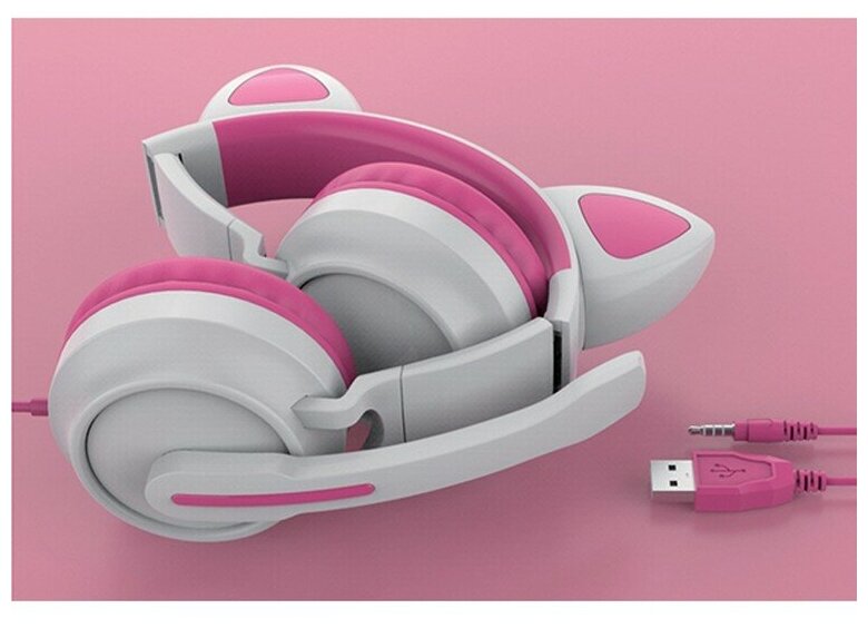 Гарнитура для игр и стриминга с подсветкой, складная, Qumo Game Cat White&pink (ghs 0035), подключен .