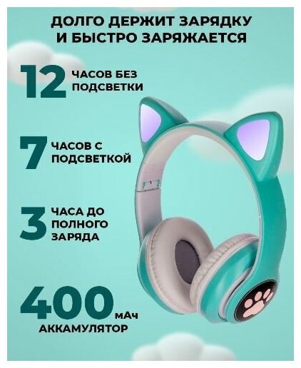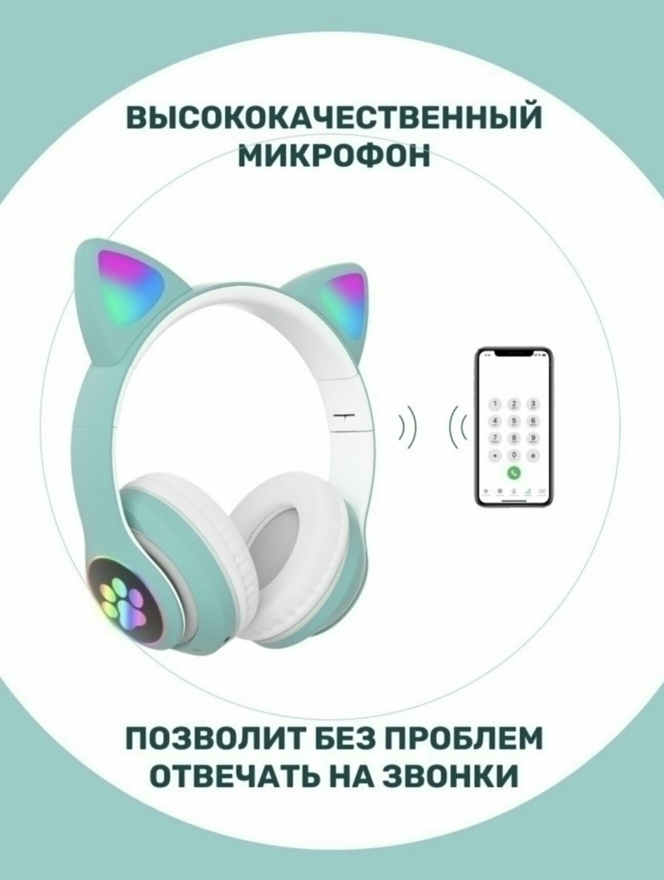 Наушники беспроводные детские с ушками / Светящиеся детские беспроводные наушники с ушками / Беспроводные наушники детские / Наушники с ушами мятные