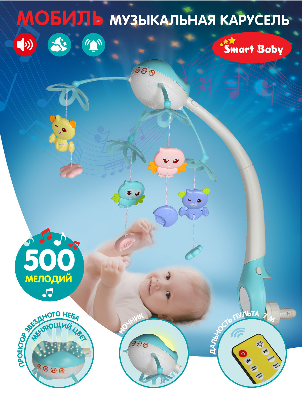 Купить Детская карусель, мобиль ТМ Smart Baby, пульт управления, ночник, проектор звездного неба, таймер, колыбельные, 500 мелодий, свет, звук, JB0333927