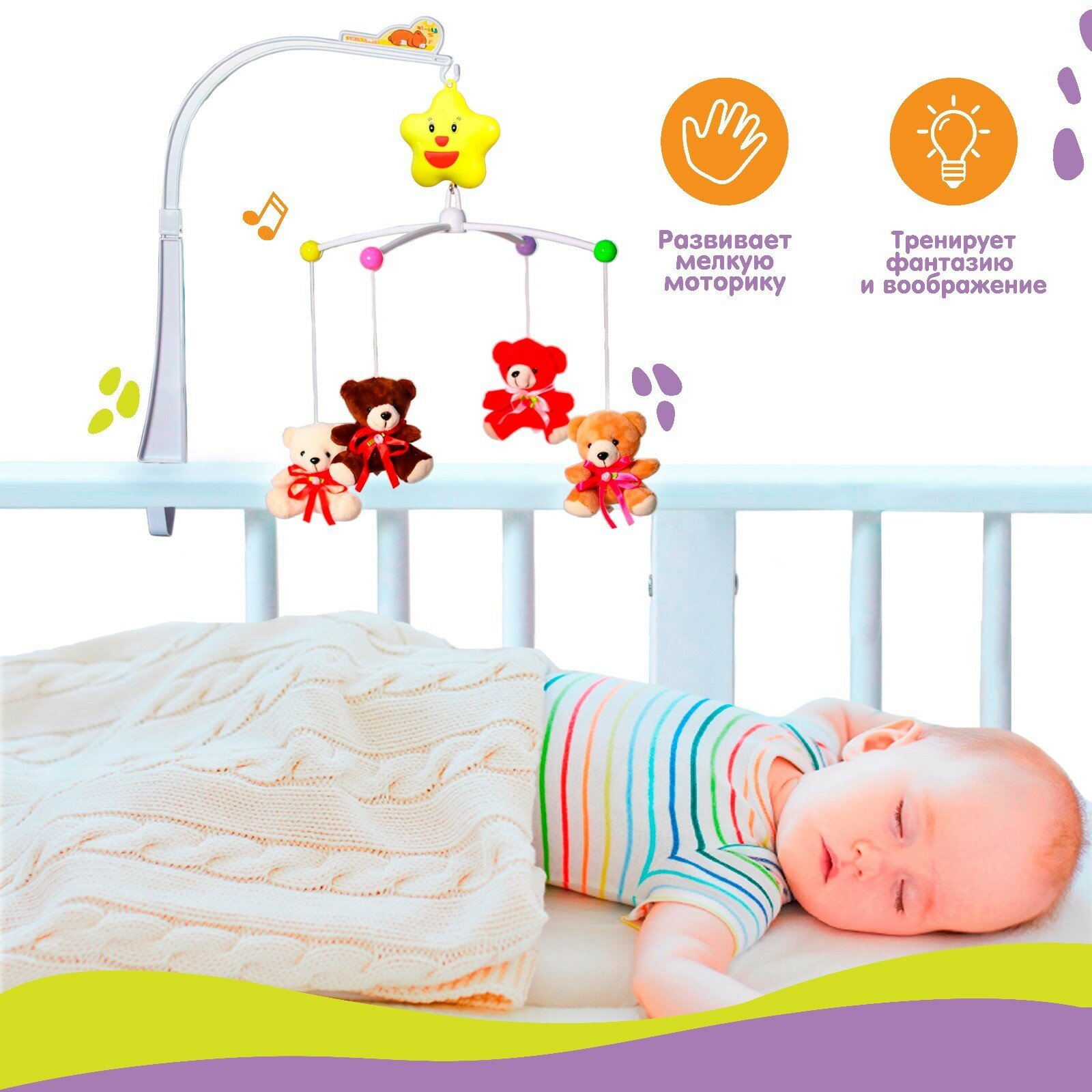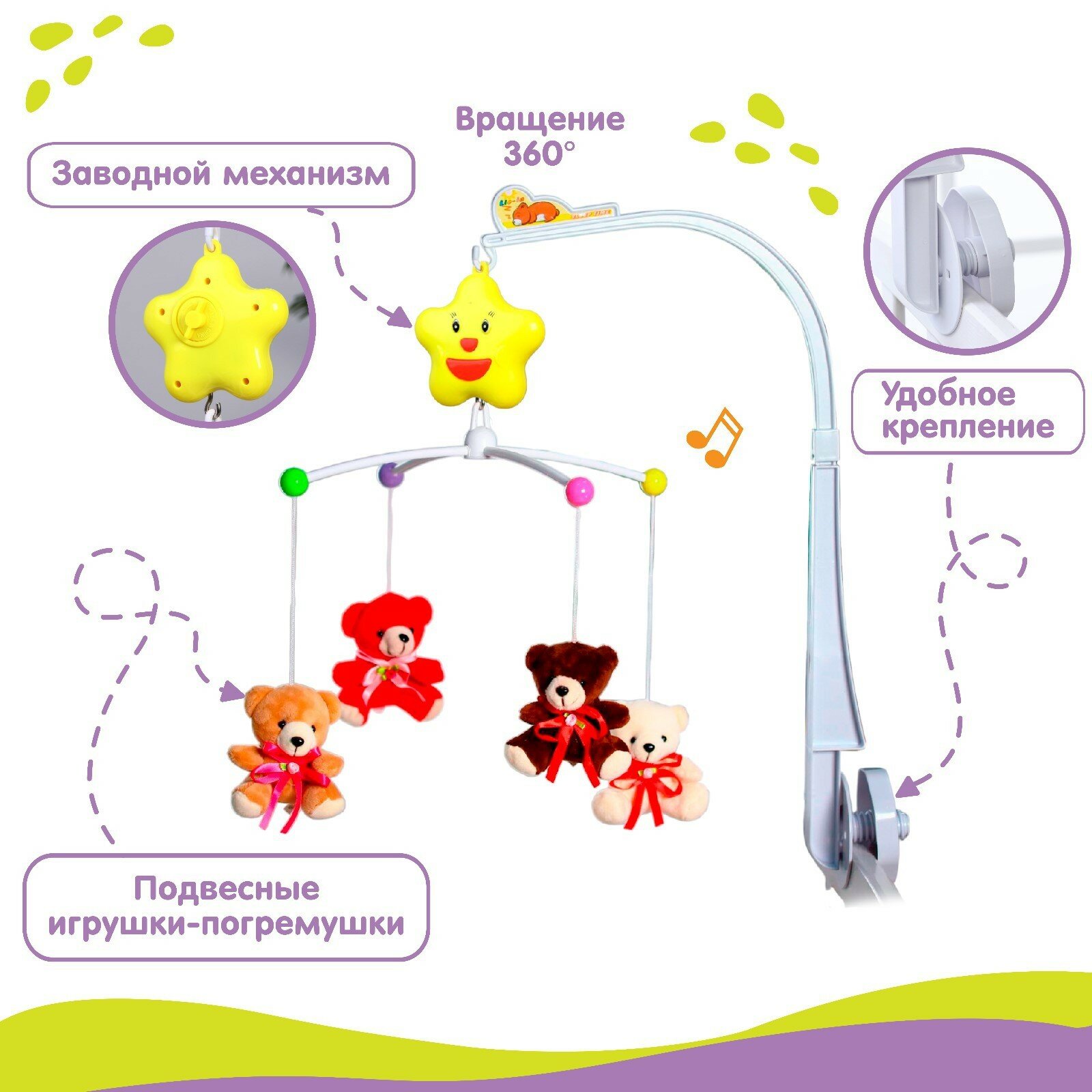 Мобиль музыкальный «Мишки с бантом», заводной, с мягкими игрушками интересное: