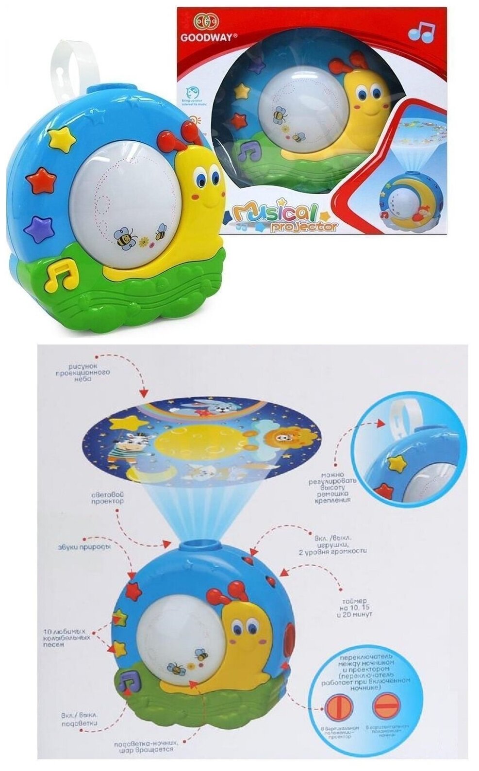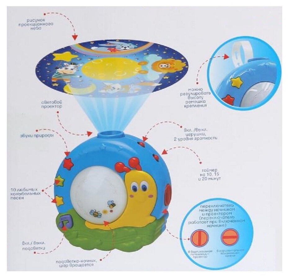 | Особенности | звуковые эффекты / ночник / проектор / регулировка громкости / световые эффекты |