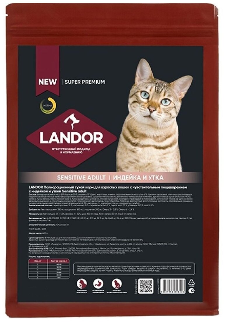LANDOR CAT ADULT SENSITIVE для взрослых кошек с чувствительным пищеварением с индейкой и уткой (0,4 кг)