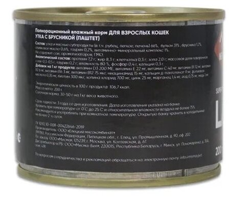 | Состав | Утка 35%, мясные субпродукты 31%(рубец, легкое, печень), бульон 31% , брусника 1,2%, оливковое масло 0,6%, таурин 0,2%, витаминно-минеральный комплекс 1%. |