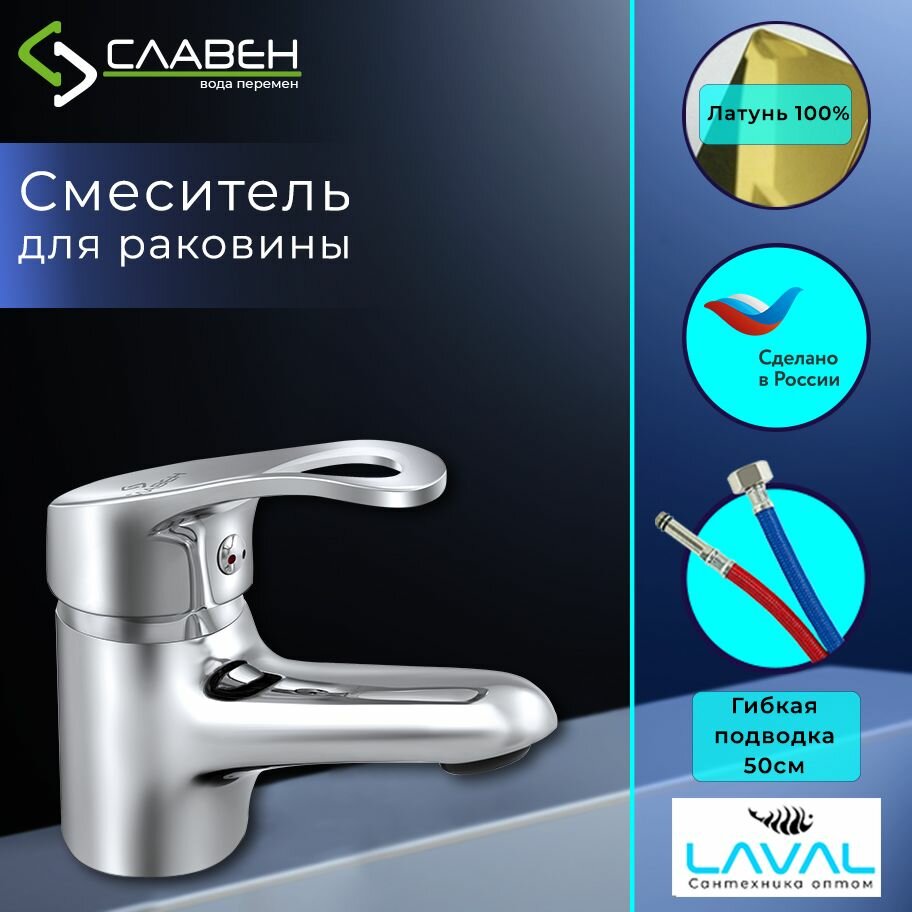 Смеситель для умывальника с литым изливом, однорычажный, хром, гибкая подводка 50см (Славен)