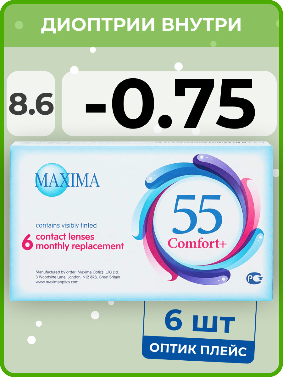 Контактные линзы Maxima 55 Comfort+, ежемесячные, -0,75 / 14,2 / 8,6 / 6 шт.