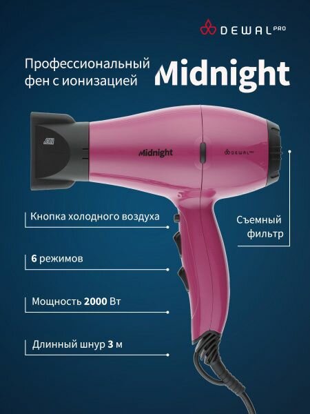 Фен Dewal Midnight, 2000 Вт, ионизация, 2 насадки, розовый