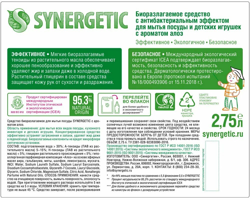 Купить Гель для мытья посуды SYNERGETIC Алоэ 2,75л 4607971452362