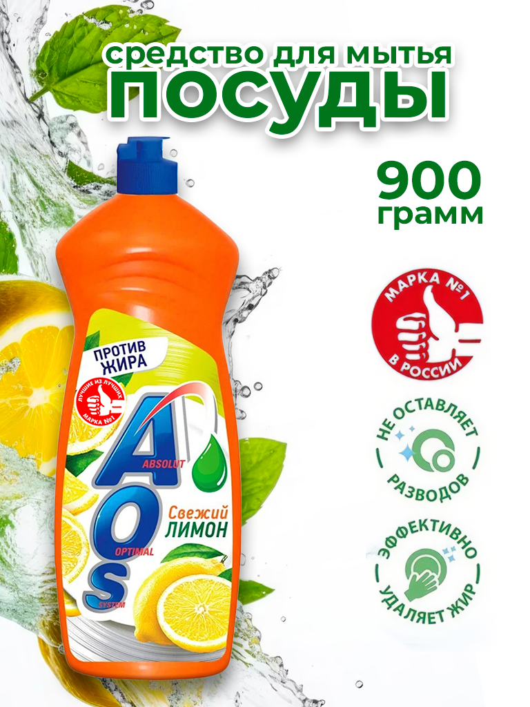 AOS Бальзам для мытья посуды, 0.9 л, Сочный лимон, №1 Против жира и максимальная смываемость