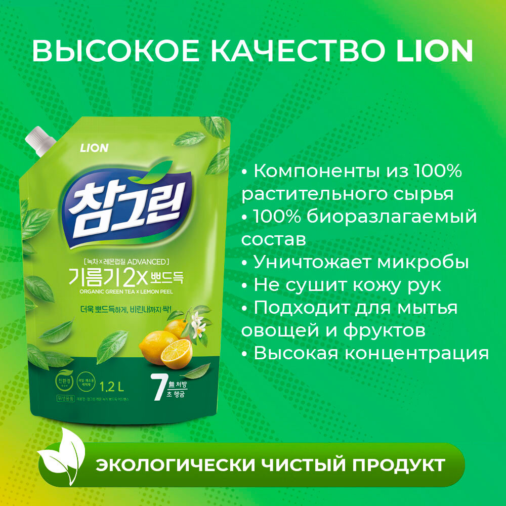 Средство для мытья посуды Lion Chamgreen Зеленый чай, мягкая упаковка с колпачком, 1.2 л