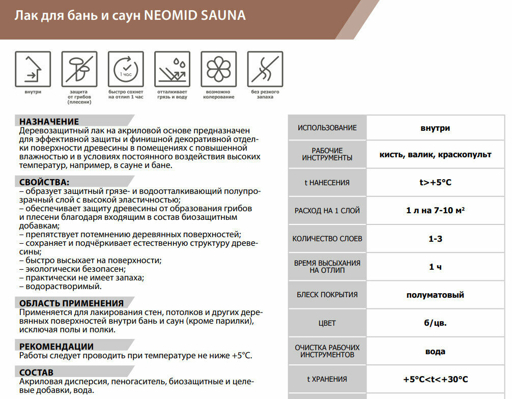 NEOMID sauna лак акриловый для бань и саун 1 л