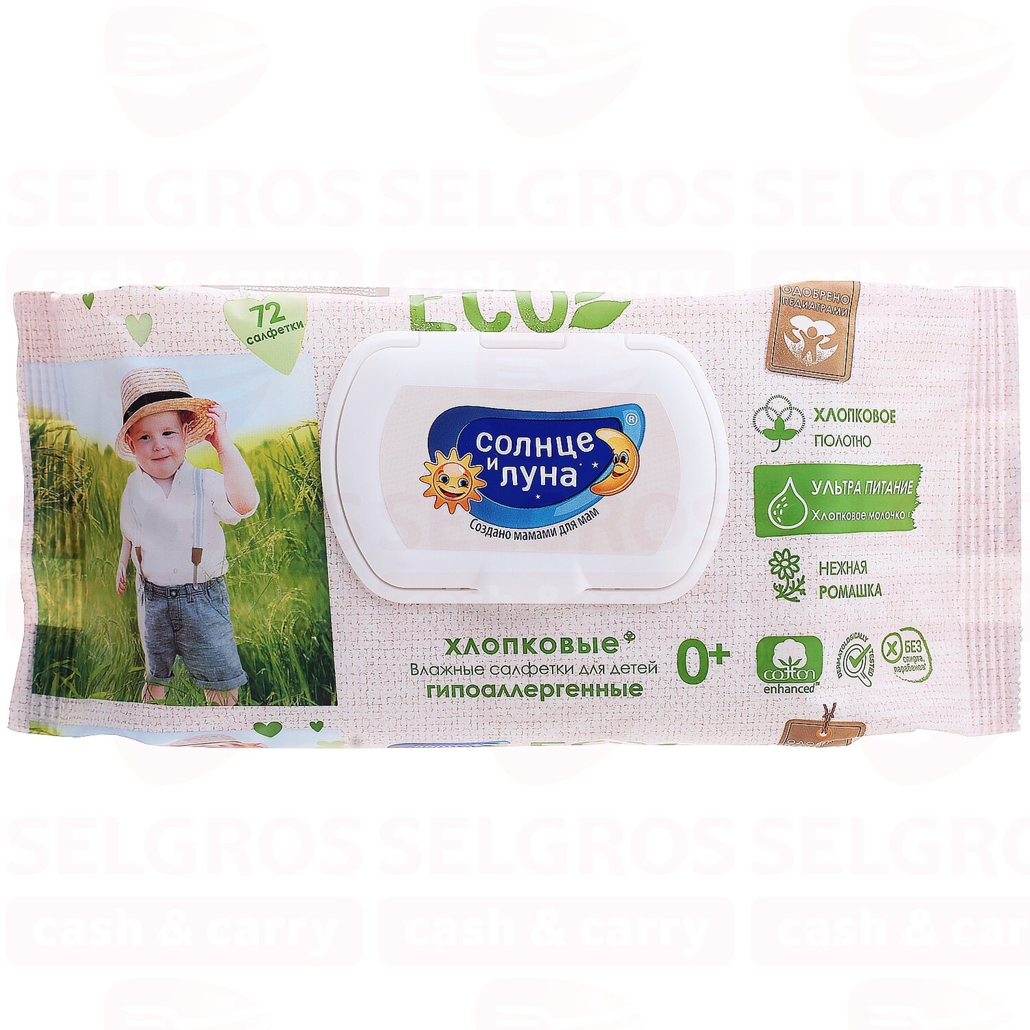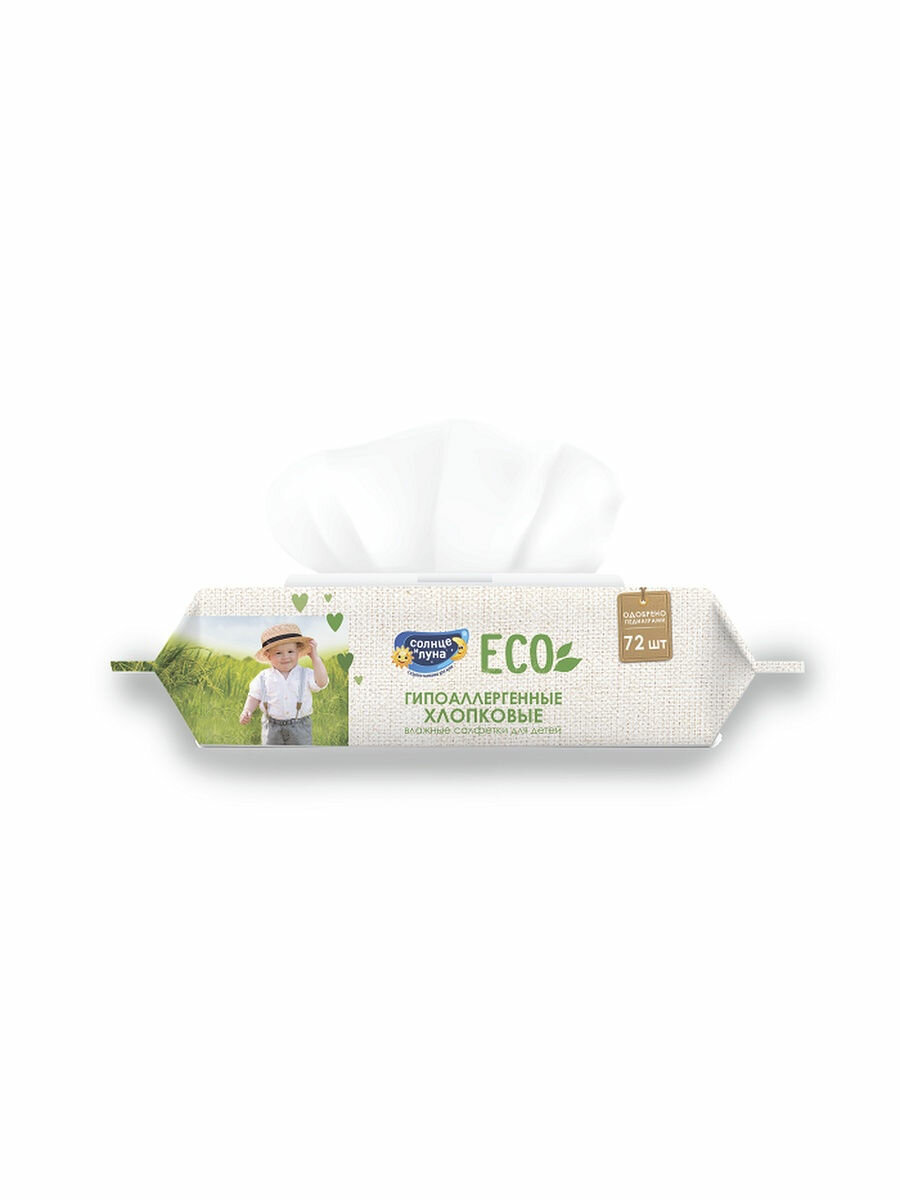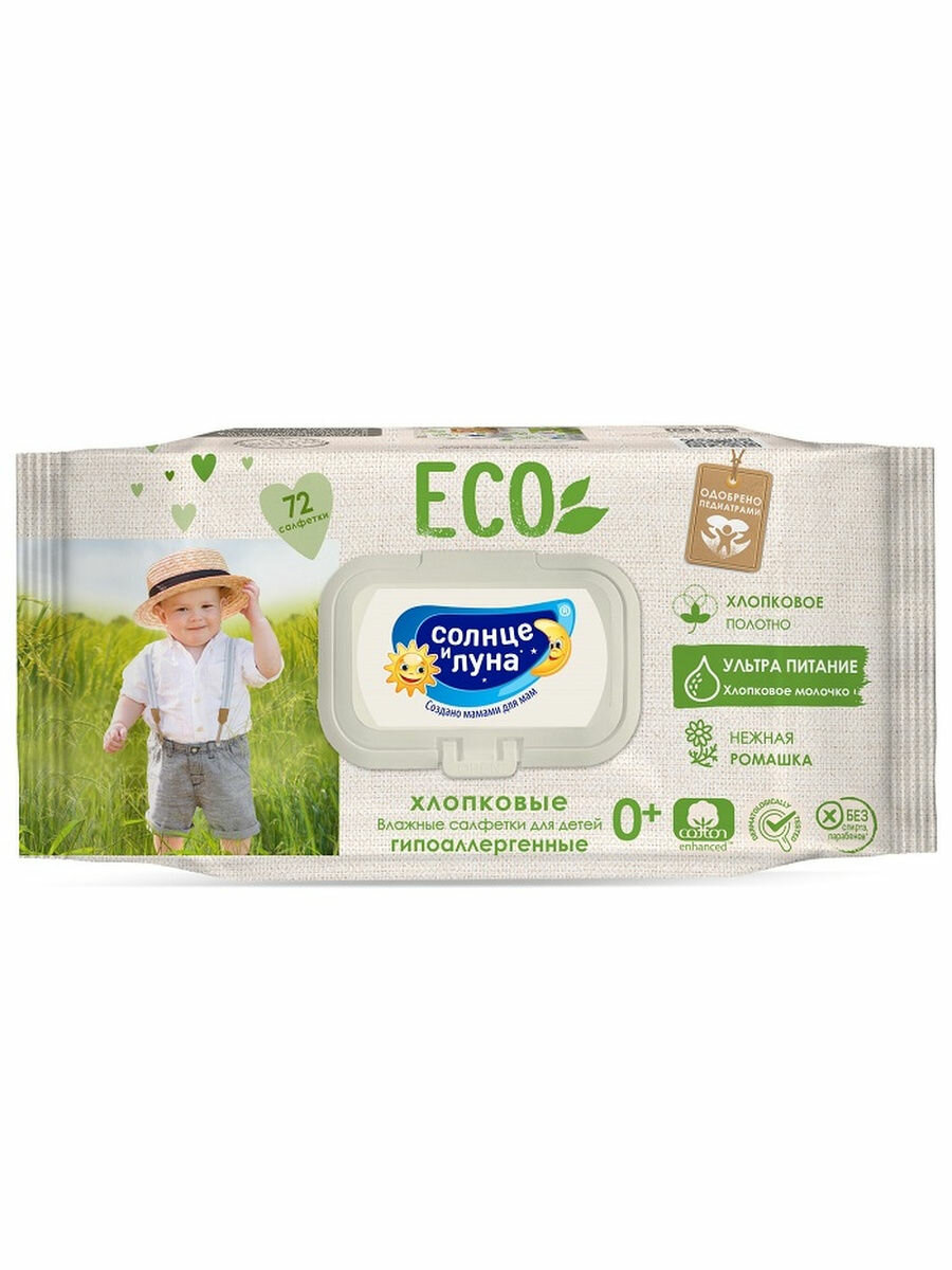 Солнце И луна ECO Влажные салфетки детские 0+ хлопковые нежная ромашка и хлопковое молочко big-pack с крышкой 72шт