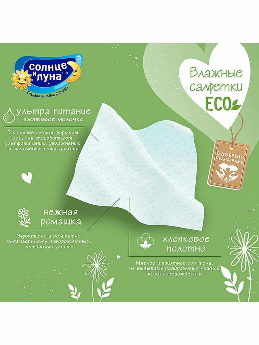Солнце И луна ECO Влажные салфетки детские 0+ хлопковые нежная ромашка и хлопковое молочко big-pack