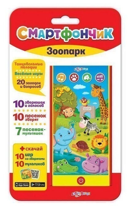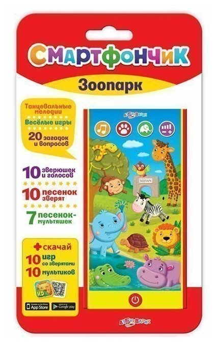 Купить Смартфончик, Азбукварик, "Зоопарк" 20 загадок и вопросов, 10 зверюшек и голосов, 10 песенок зверят, 7 песенок мультяшек