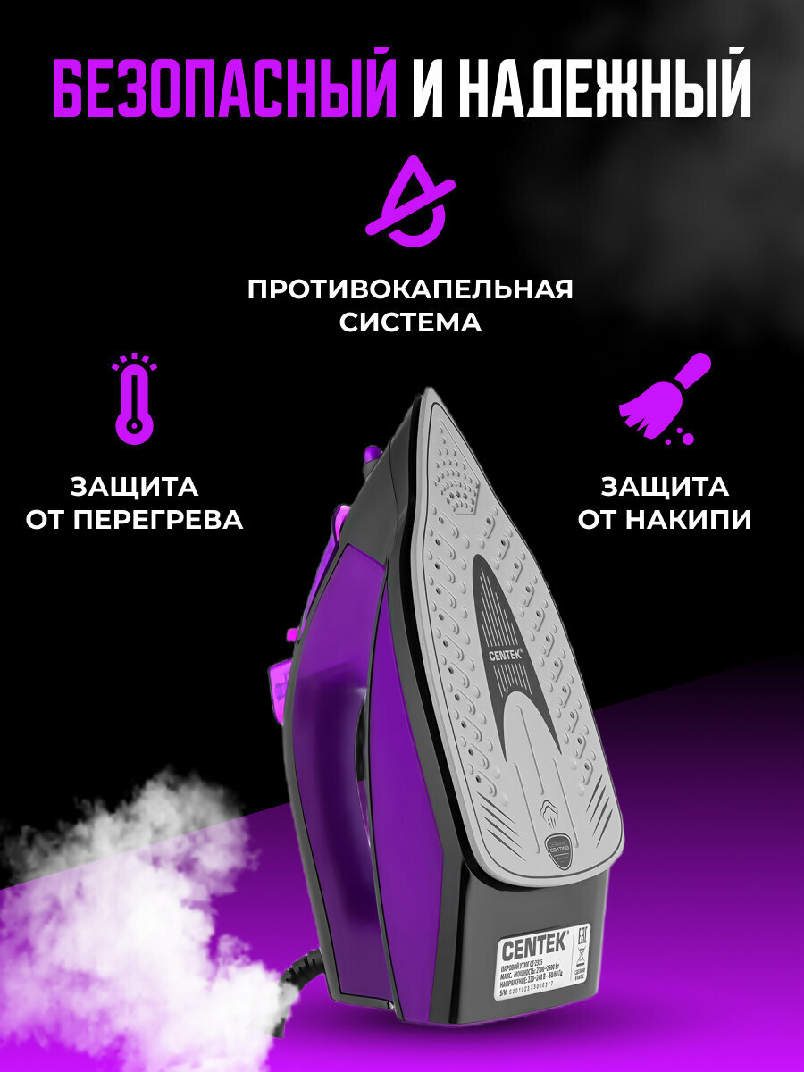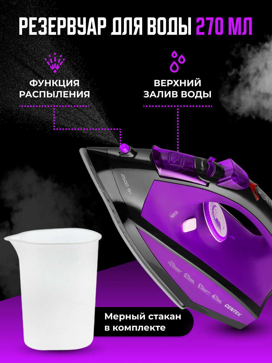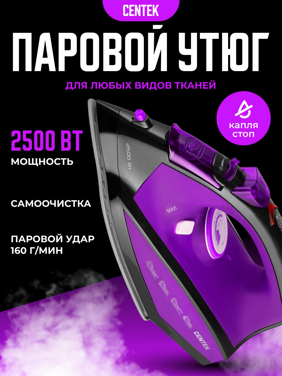 Утюг Centek Ct-2355, 2500 Вт, керамическая подошва, 200 мл, 40 г/мин, фиолетовый Centek 9899067 .