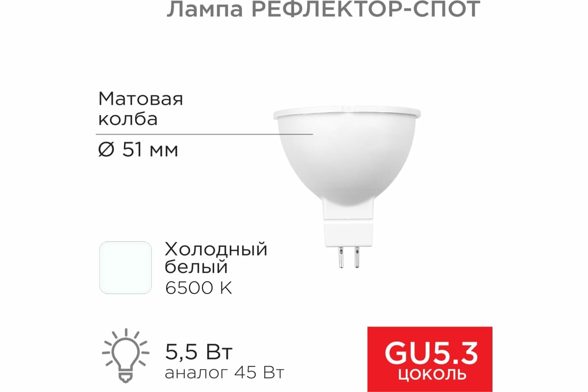 Лампа светодиодная Rexant Рефлектор, 5,5 Вт, 6500 К, GU5.3, холодный свет интересное: