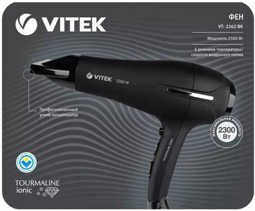 Фен Vitek VT-2262 BK черный [полноразмерный, 2300 Вт , турмалиновая ионизация]