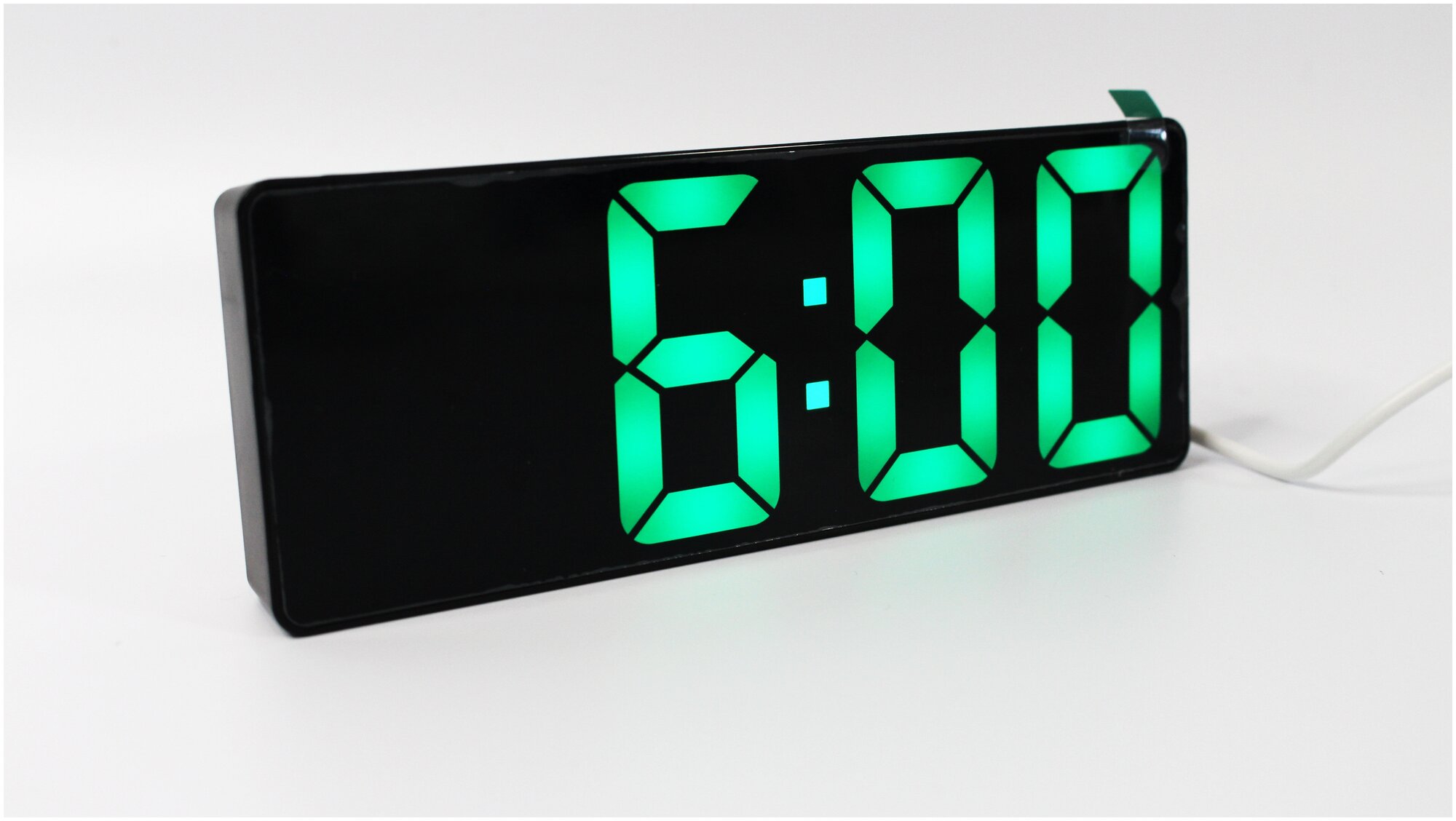 Часы электронные цифровые настольные с будильником, термометром и календарем зелёная подсветка (черный корпус) интересное: