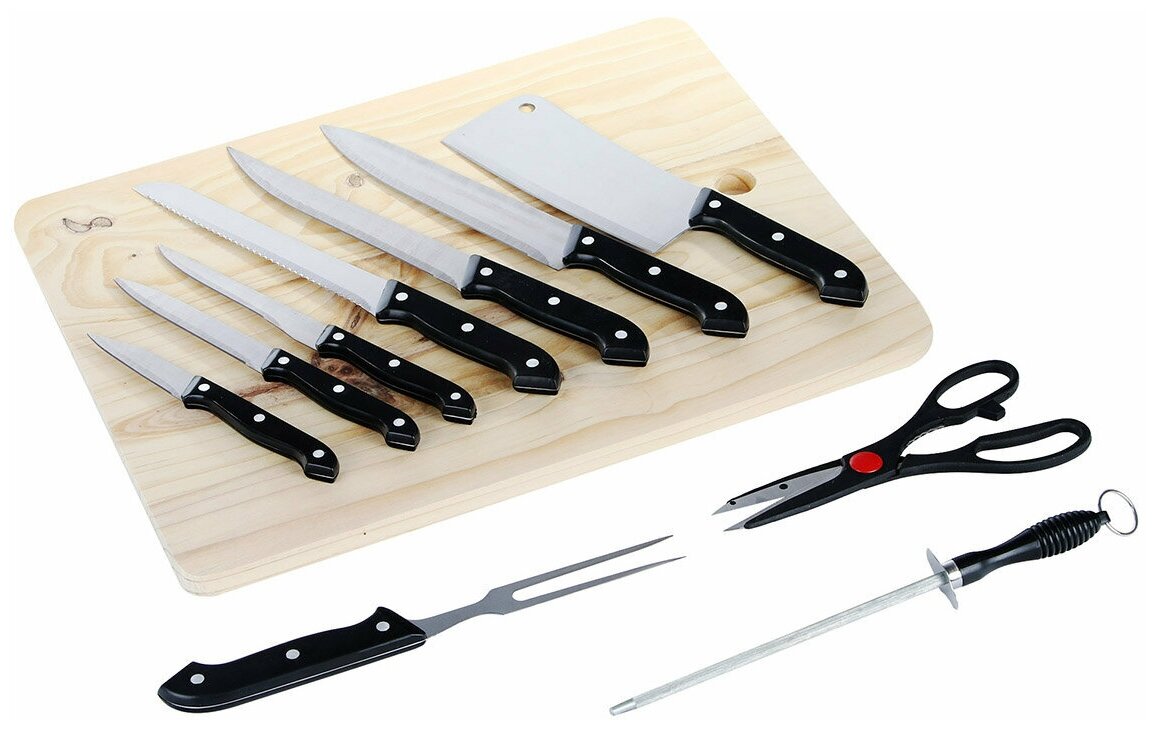 Купить Набор для кухни 11 предметов доска разделочная дерево, 7 ножей, мусат, ножницы, вилка в блистере