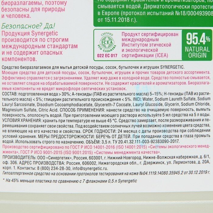 Купить Synergetic Средство для мытья детской посуды, сосок, бутылочек и игрушек 3,5 л