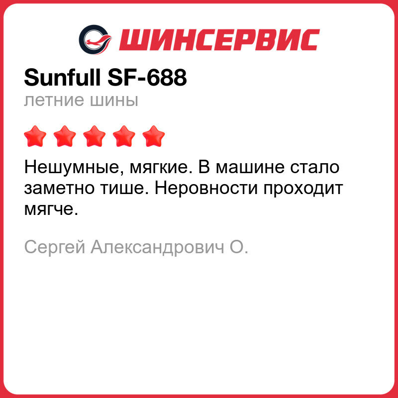 Ниже Вы можете прочитать отзывы на Sunfull SF-688 155/65 R14 75T, ознакомится с подробными характеристиками, посмотреть интересные обзоры и фотографии на Sunfull SF-688 155/65 R14 75T.
