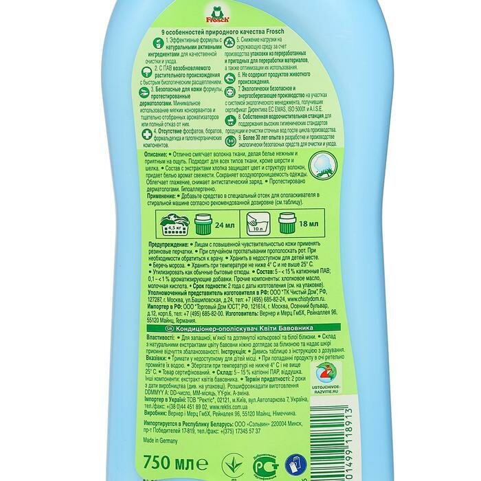 Кондиционер-ополаскиватель для белья Frosch фрош Свежесть (Цветы хлопка), концентрированный, 750 мл