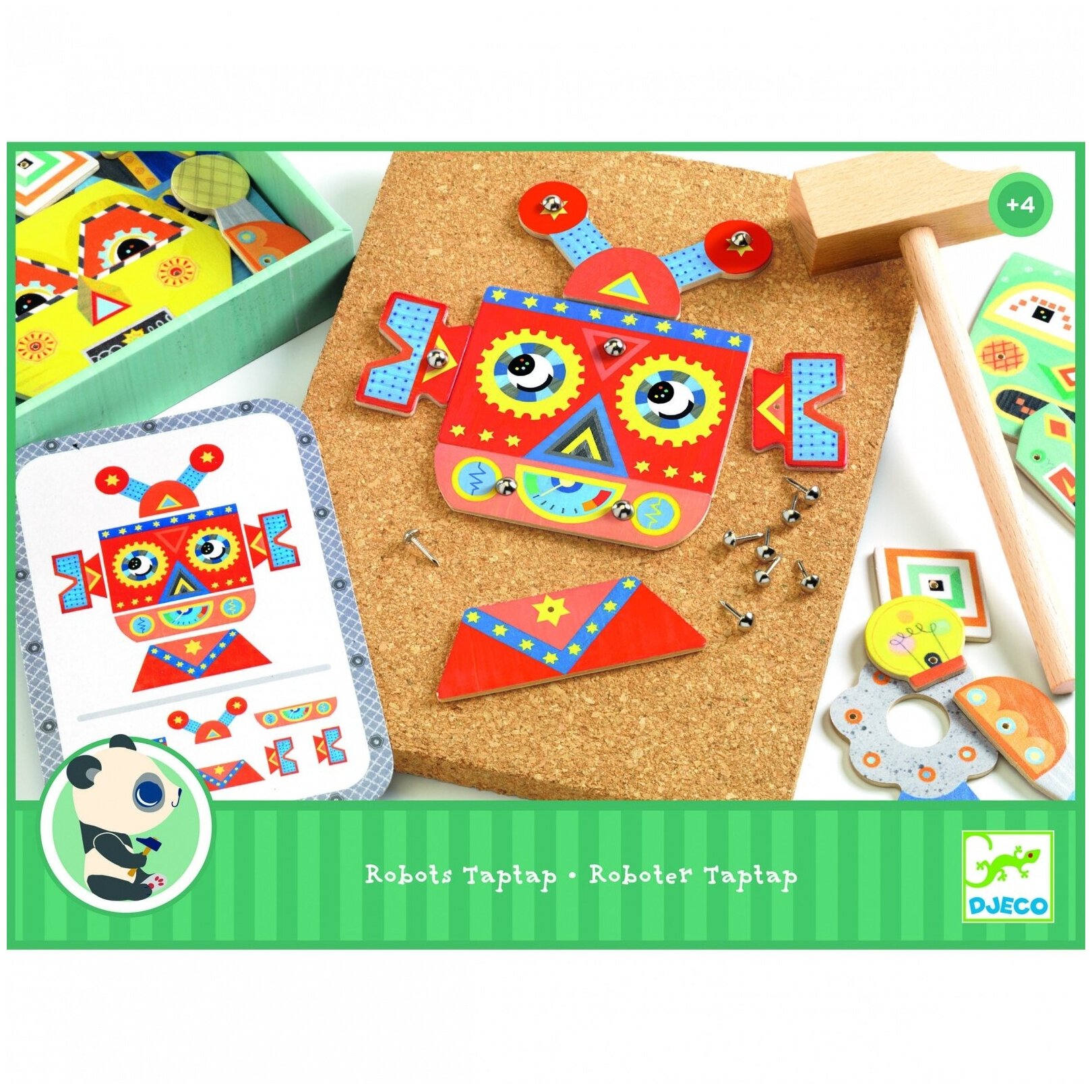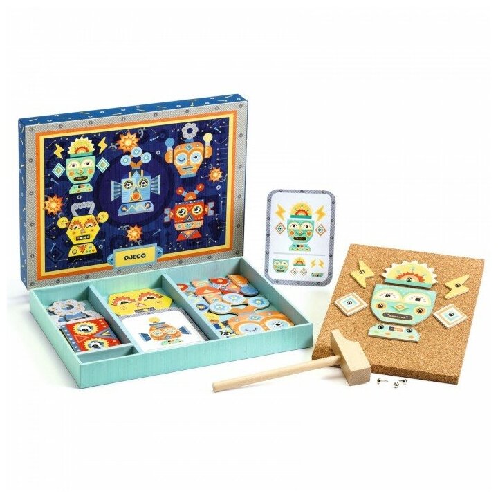 | Комплектация | пробковая доска для сборки моделей, деревянный молоток, 5 двусторонних карточек с инструкцией по сборке, 40 гвоздиков, деревянные детали роботов |