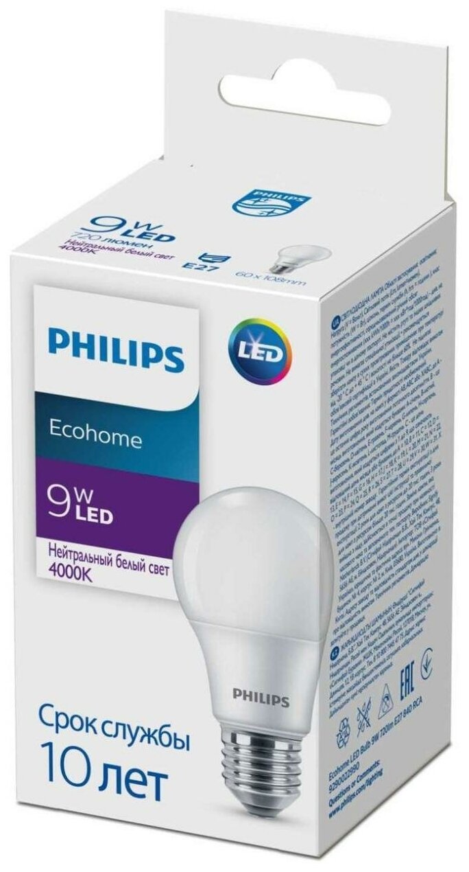 Philips Лампа светодиодная Philips Ecohome LED 871951437767700, E27, A60, 9 Вт, 4000 К
