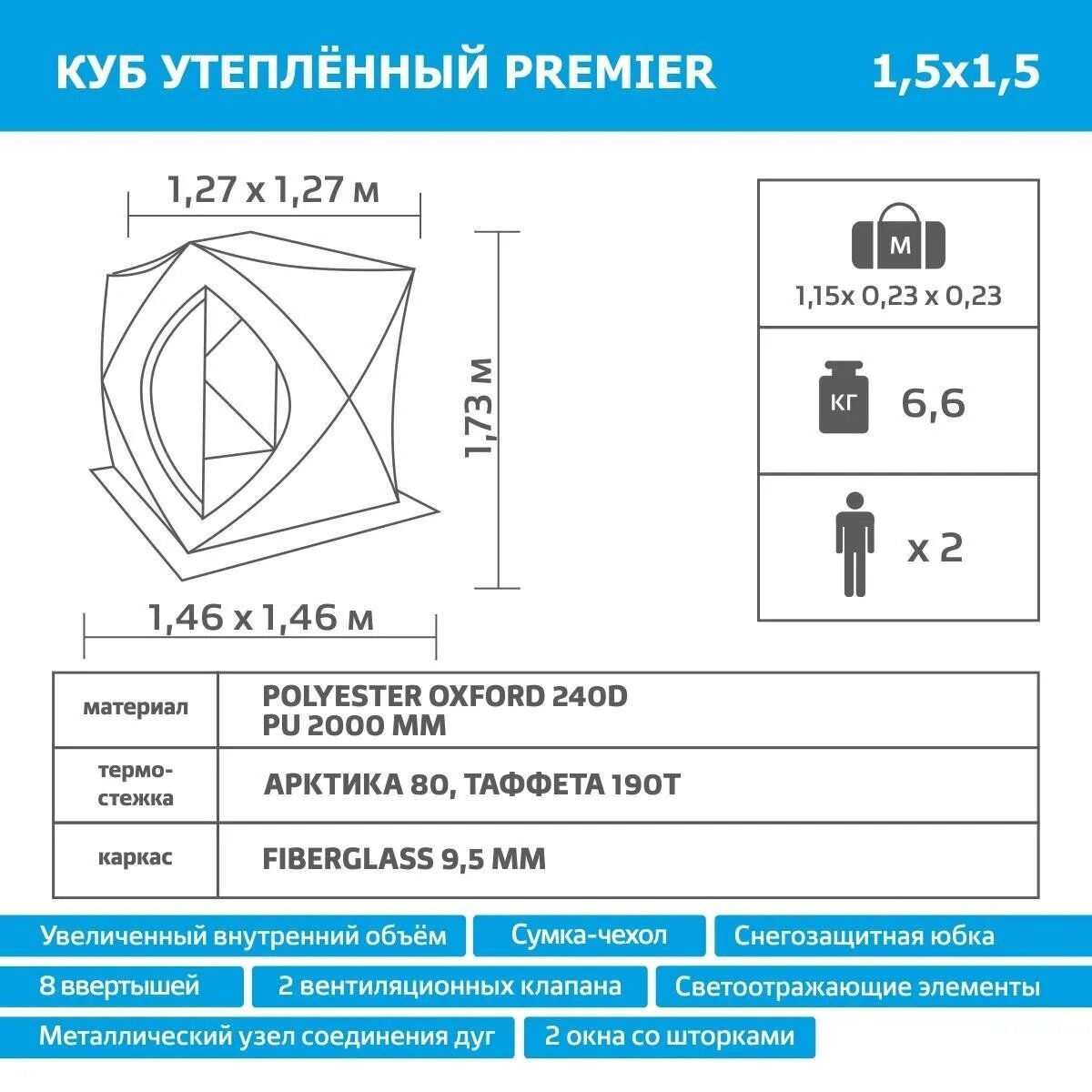 | Особенности | вентиляционные отверстия / ветрозащитная/снегозащитная юбка / внутренние карманы / внутренняя палатка / окна / усиленные углы |