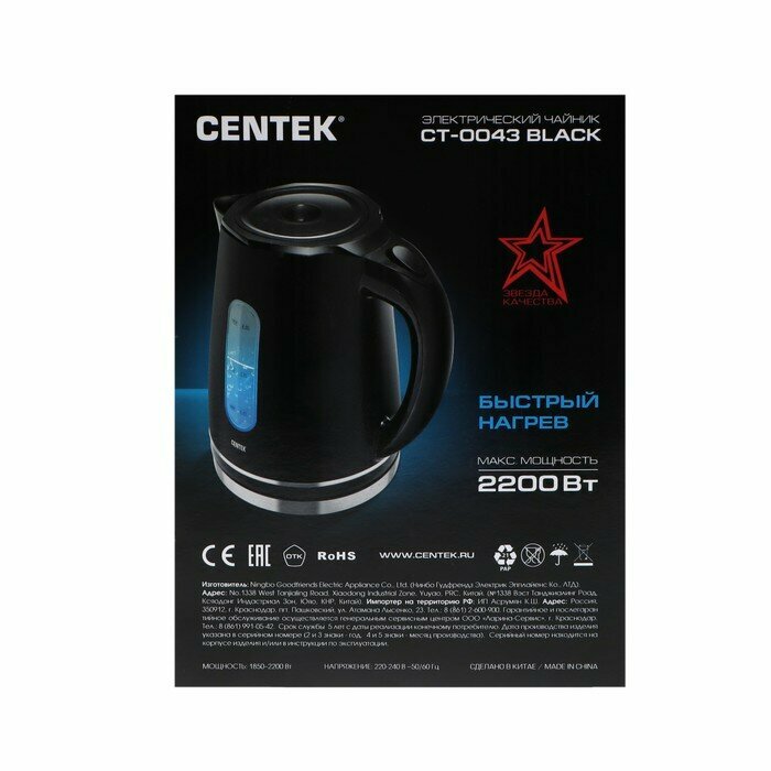 Чайник электрический Centek CT-0043, пластик, 2 л, 2200 Вт, подсветка, черный интересное: