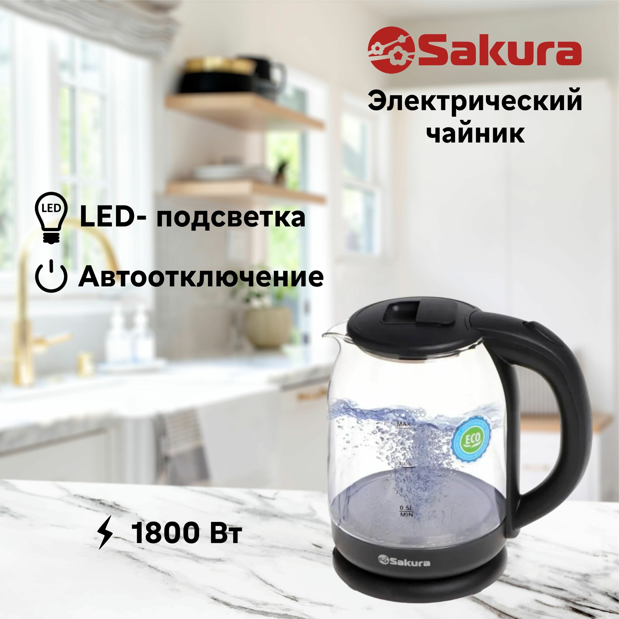 Чайник Sakura SA-2709SPBK черный, стеклянный с подсветкой 1.8л