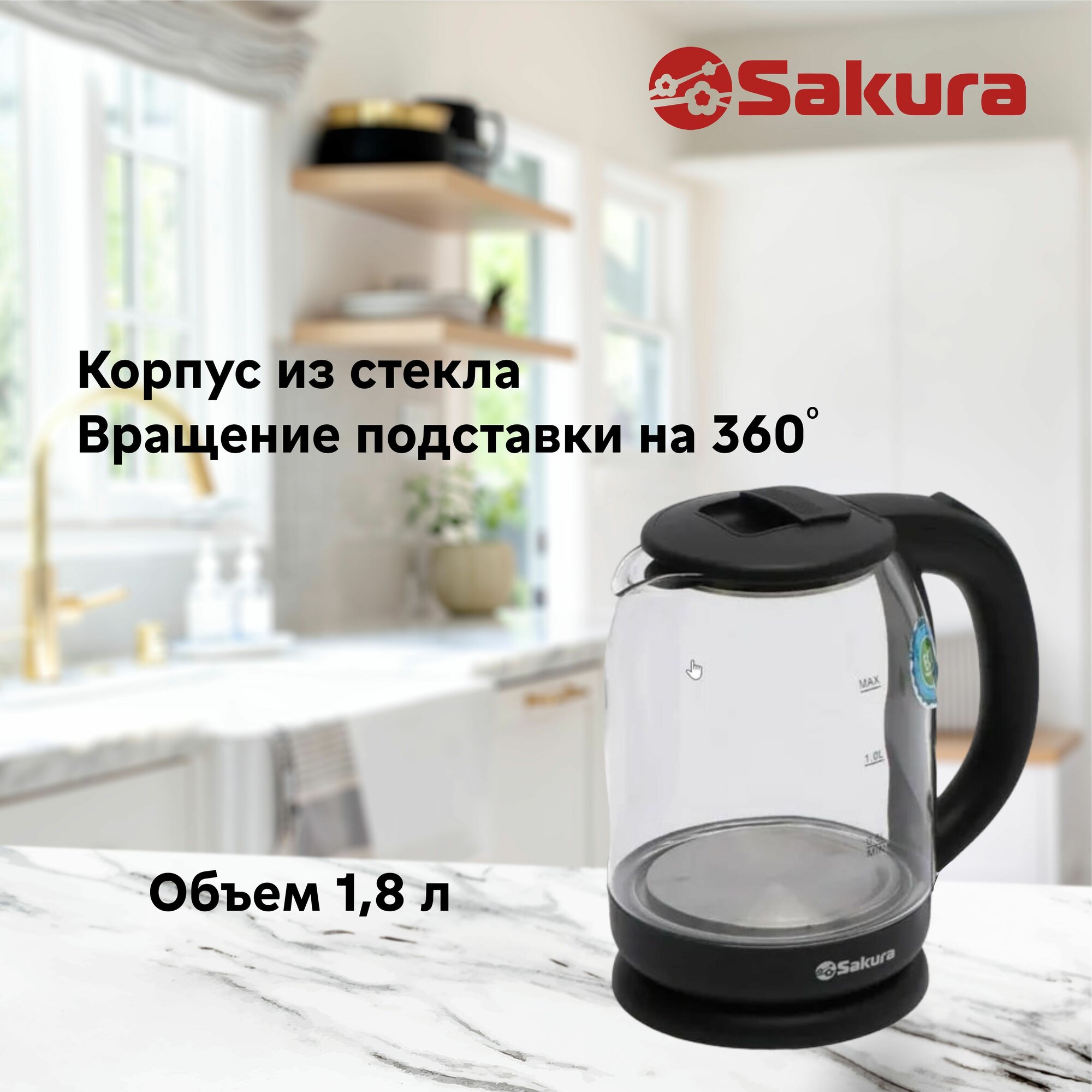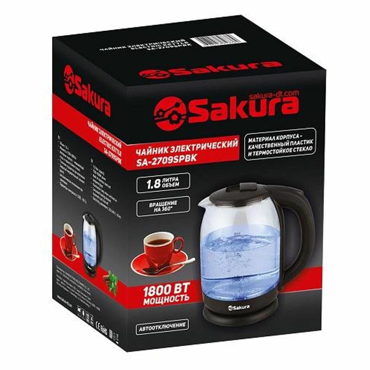 Чайник электрический Sakura SA-2709SPBK, стекло, 1.8 л, 1800 Вт, чёрный 9438298