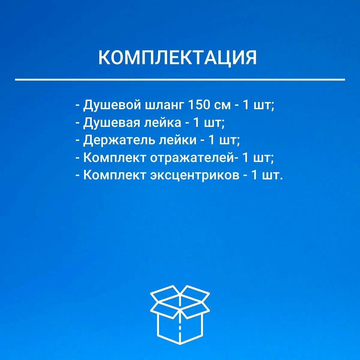 | Комплектация | Смеситель / инструкция по установке / гарантийный талон / душевая лейка / держатель лейки / комплект эксцентриков / комплект отражателей |