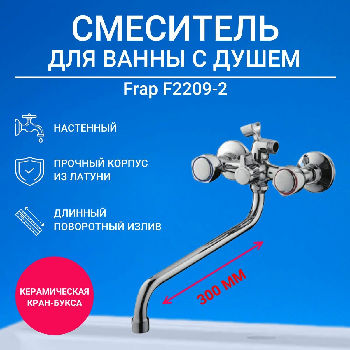 Смеситель для ванны с душем Frap F2209-2, с длинным изливом, двухвентильный, хром