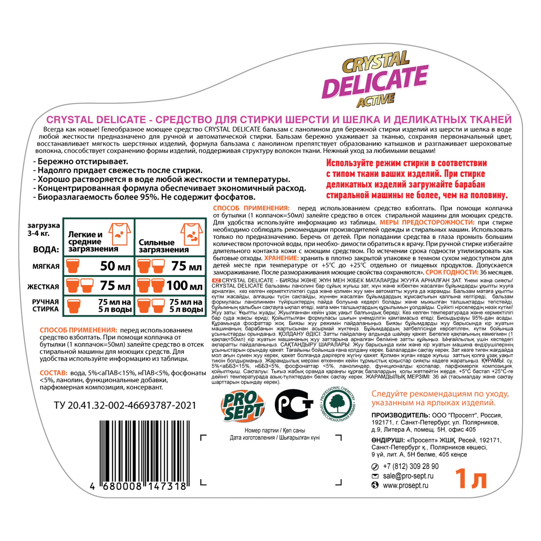 Жидкое моющее средство Prosept Crystal Delicate, для стирки шерсти, шелка и деликатных тканей, 1 л