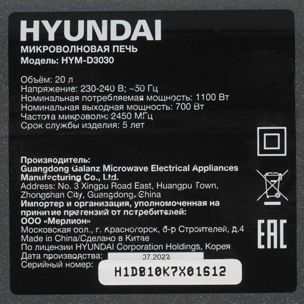 Микроволновая Печь HYUNDAI HYM-D3030 черный интересное: