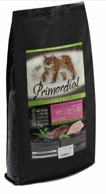 PRIMORDIAL Корм для котят до 1 года беззерновой утка и индейка, 6 кг