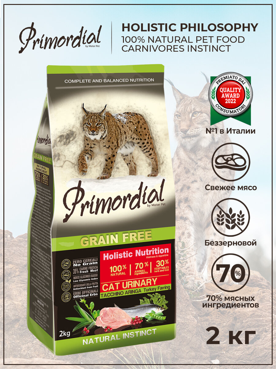 Сухой корм для кошек Primordial при мочекаменной болезни, беззерновой, с индейкой и сельдью, 2 кг
