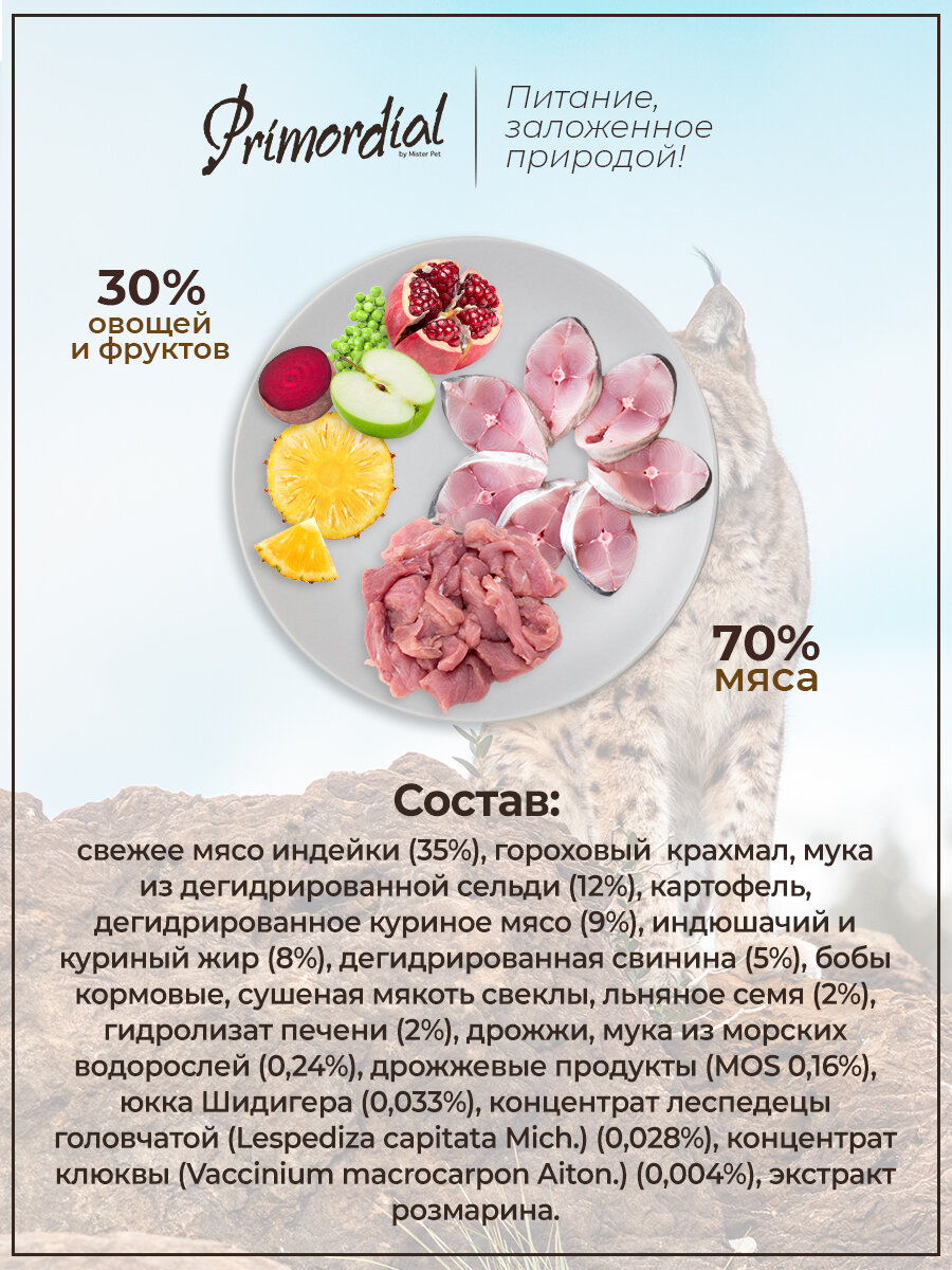 Сухой корм PRIMORDIAL для кошек беззерновой с МКБ с индейкой и сельдью 400г MGSP14400