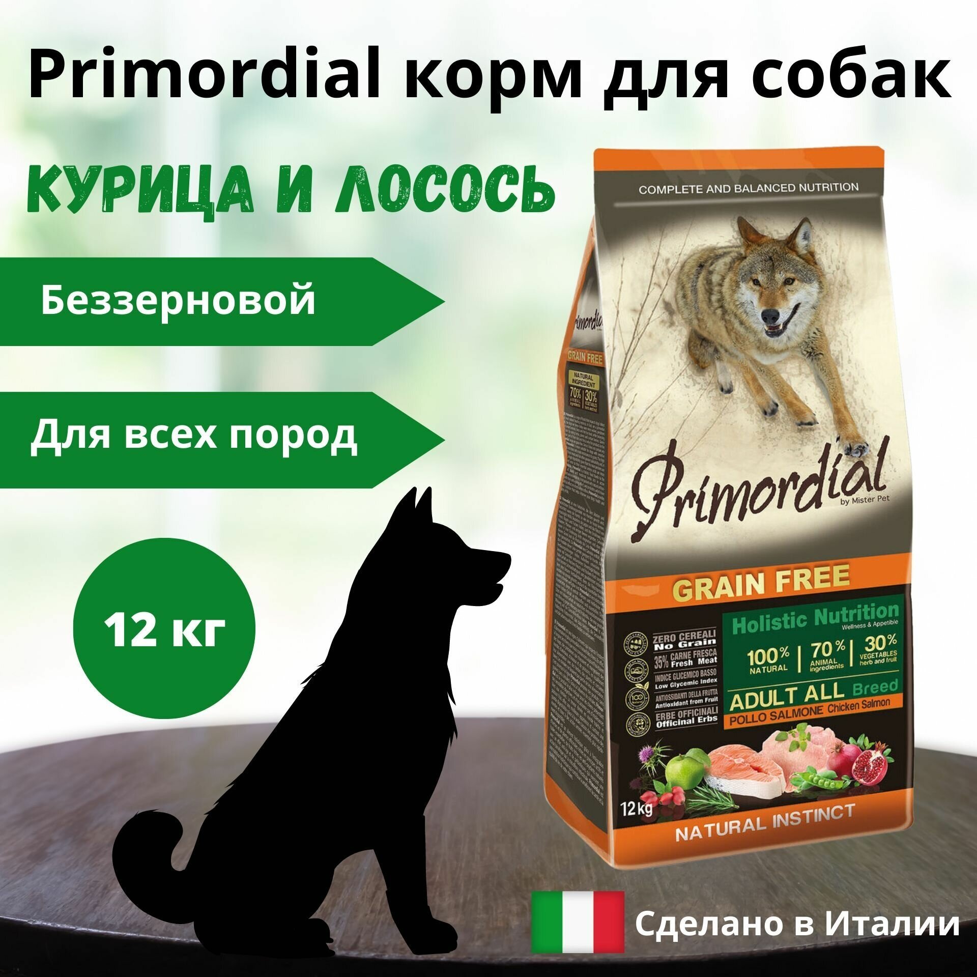 PRIMORDIAL ADULT ALL BREED беззерновой для взрослых собак всех пород с курицей и лососем (12 кг)