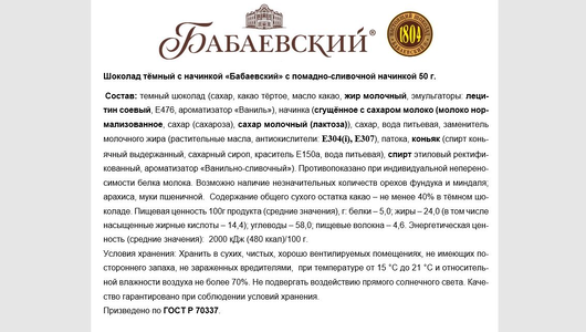 Шоколад Бабаевский с помадно-сливочной начинкой, 20шт х 50г