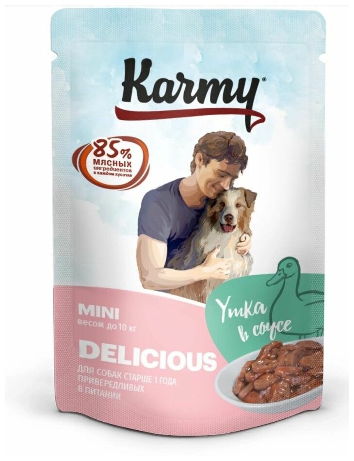 Влажный корм для собак KARMY 80 г Mini Delicious для собак мелких и миниатюрных пород, привередливых в питании, утка кусочки в соусе