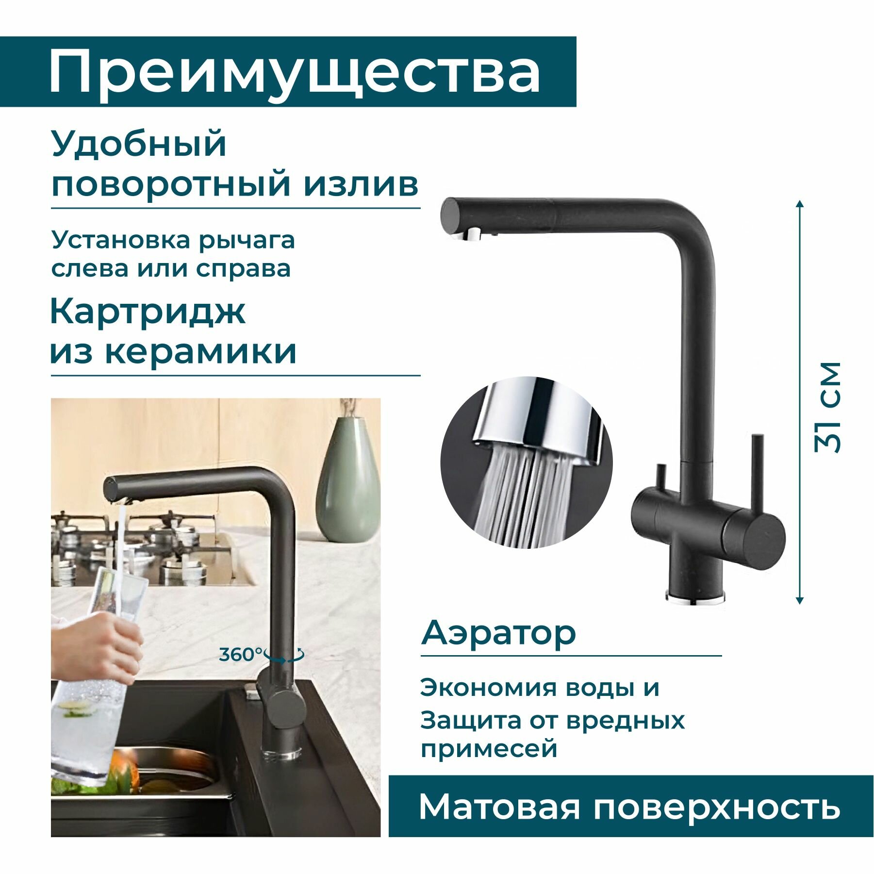 Купить Смеситель для раковины с фильтром и краном для питьевой воды ALVEUS AQUILA G91 поворотный для кухни и ванной. Латунь. Цвет черный матовый