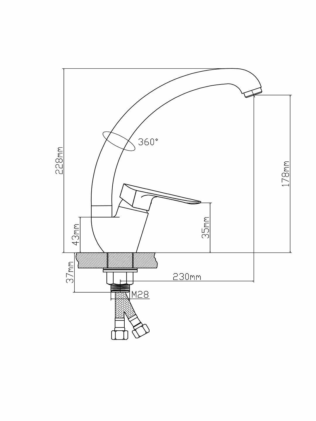 Смеситель для кухни, BOOU B8274-10F, латунь, поворотный излив, однорычажный, с гибкой подводкой