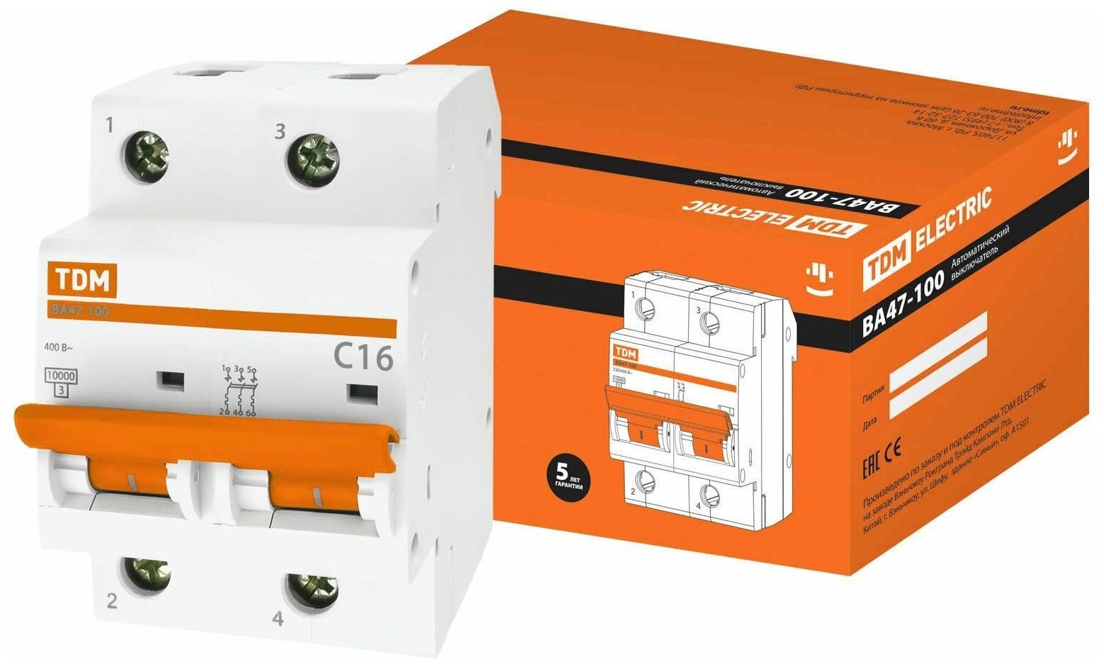Авт. выкл. ВА47-100 2Р 16А 10кА х-ка С TDM сн/пр (в упаковке 1 шт.)
