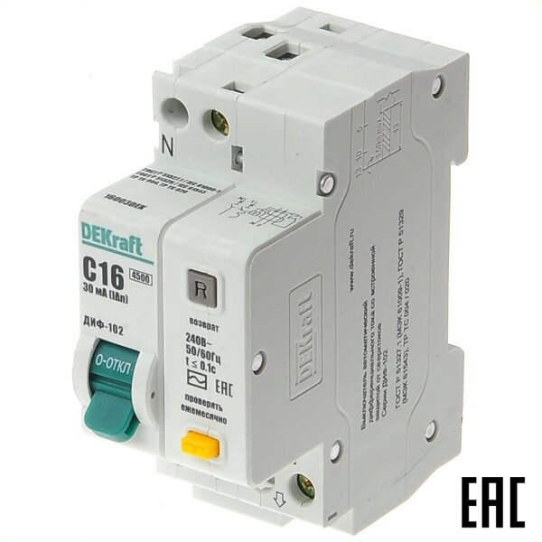 ДИФ-102 дифференциальный автоматический выключатель 1P+N, 16А, 30mA, тип AC, 4,5kA, (хар-ка C) DEKraft, 16003DEK